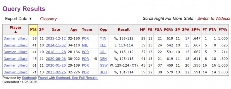 利拉德(6次) 利拉德生涯至今6次单场投进10+三分,2023年2月对阵火箭,表哥38投22中,三分22投13中,罚球14中14,砍下71分6篮板6助攻。开拓者131比114取胜。
