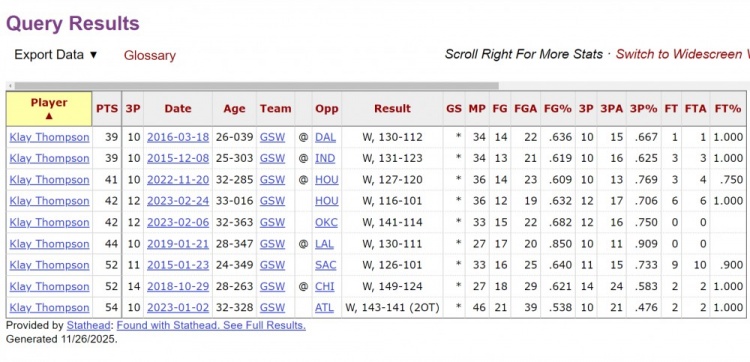 克莱(9次) 克莱生涯至今9次单场10+三分,全部都在勇士时期。2018年10月对阵公牛,克莱出战26分33秒,投篮29中18,三分24中14,罚球2中2,狂砍52分4篮板2抢断,勇士以149-124大胜公牛。此役克莱创造了NBA历史单场三分纪录。