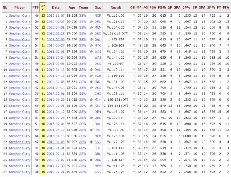 库里(27次) 库里生涯至今已经27次单场10+三分,2016年11月勇士116比106击败鹈鹕的比赛,库里26投16中,三分17中13,射落46分。