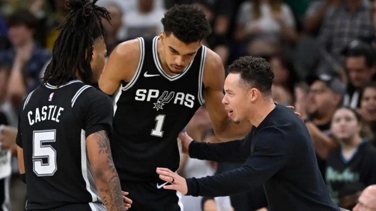 要聊这支马刺,你永远绕不开文班亚马,就像聊三分球绕不开库里一样。经过两年进化和少林特训,22岁的文班已显现出超巨之姿,场均26分12篮板4助攻3.6盖帽,真实命中率61%。开赛前五场更是轰出了30分15篮板5盖帽的场均数据,带领马刺豪取五连胜,把仗着内线深度试图单防文班的独行侠打出33分分差,让所有球队都不敢单防。 到这一步,文班已经打出了绝对的超巨价值,他以一己之力改变了敌我双方的攻防体系。防守端像戈贝尔一样让人绕着他走,还能像小贾伦-杰克逊一样轮转到外线,进攻端在前两年的内线吃饼和外线三分的基础上点出面框进攻技能包,极大降低自己和全队的进攻成本,从三分线内一步合球、两步跨到篮下暴扣的样子,像极了刚被基德点化的字母哥。 说到字母哥,马刺五连胜的最后一场对手热火队,就有极其丰富的防守经验,他们用韦尔这样的机动型锋线干扰文班接球、顶他重心,一旦文班拿球突破,协防干扰就会如期而至。 面对热火的针对,文班开局的魔力不再,只以44%的命中率拿下27分18篮板,但同时送出了仅次于卡斯尔的6次助攻。 联盟各队迅速得到启发,他们像防杜兰特和字母哥那样,让文班的数据回到了正常内线巨星的水平。但代价就是马刺其他人得吃得喝,马刺被太阳暴打那一场,文班被防到只拿9分,可卡斯尔和凯尔登这样的外线队友却利用“班有引力”吃了个爽。 这从侧面证明了文班的赛场影响力,却也从正面印证了马刺其他人的水平——约基奇得分少助攻多掘金就能赢,是因为穆雷戈登们真的能打死对面,而文班这样马刺就很可能输球,是因为队友的实力还不够强。 一切对这支马刺的质疑都源于此。福克斯、卡斯尔、瓦塞尔、哈珀的四后卫阵容兼容性严重存疑;凯尔登、巴恩斯、尚帕尼、索汉的锋线则明显不够看,但在广大球迷眼中,教练米奇才是这支马刺最大的短板,以至于扩充五号位轮换都显得没那么迫切了。 更麻烦的是,马刺的核心们还没磨练出化学反应。上赛季的文班和福克斯先后休战,本赛季文福组合刚合体,就被勇士双杀,文班遭遇腿部伤病,甚至科内特、卡斯尔和哈珀也高挂免战牌。以至于马刺几乎没机会凑出满血阵容,年轻和年老的队员们承担的任务也如一波未平,一波又起。