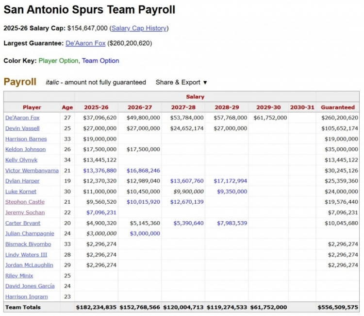 归根结底,现在的马刺是一支再标准不过的重建上升期球队,有明确的建队节奏,甚至在巨星上限和后场深度上超出了重建队的平均水平。抛开部分急功近利的杂音,马刺截至目前的操作和表现都称得上优秀。 至于争议最大的福克斯顶薪占空间问题,且不说先买来福克斯、后选中哈珀的时间顺序(文班在交易后坦言“福克斯为我们带来了很多优势,我们的目标更容易实现了”),考虑到NBA球队的薪资空间随着新转播合同水涨船高、今年光是2亿以上的球队就有10支,卡斯尔和哈珀的新秀合同要延续到28、29年,巴恩斯和奥利尼克合计3200万的合同明年就到期......就算文班提前签下超级顶薪,和福克斯年均吃下1.2亿,马刺也有空间补强,更不用说潜在的交易选项了。