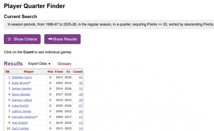 足球比分网12月02日讯 湖人主场108-125不敌太阳。 首节比赛,东契奇打满首节,11中8,三分5中2,罚球2中2,单节20分3板1助! 这是东契奇生涯第28次单节20+,追平布克&利拉德,并列历史第四! 这也是东契奇4场比赛第3次首节20+! 全场比赛,东契奇出战31分33秒,26中15,其中三分8中3,罚球5中5,得到38分11篮板5助攻9失误,正负值-25。 单节20+历史前10如下: 1、库里43次 2、科比 36次 3、哈登 32次 4、布克 28次 5、利拉德 28次 6、东契奇28次 7、詹姆斯26次 8、安东尼 14次 9、恩比德 14次 10、拉文 14次