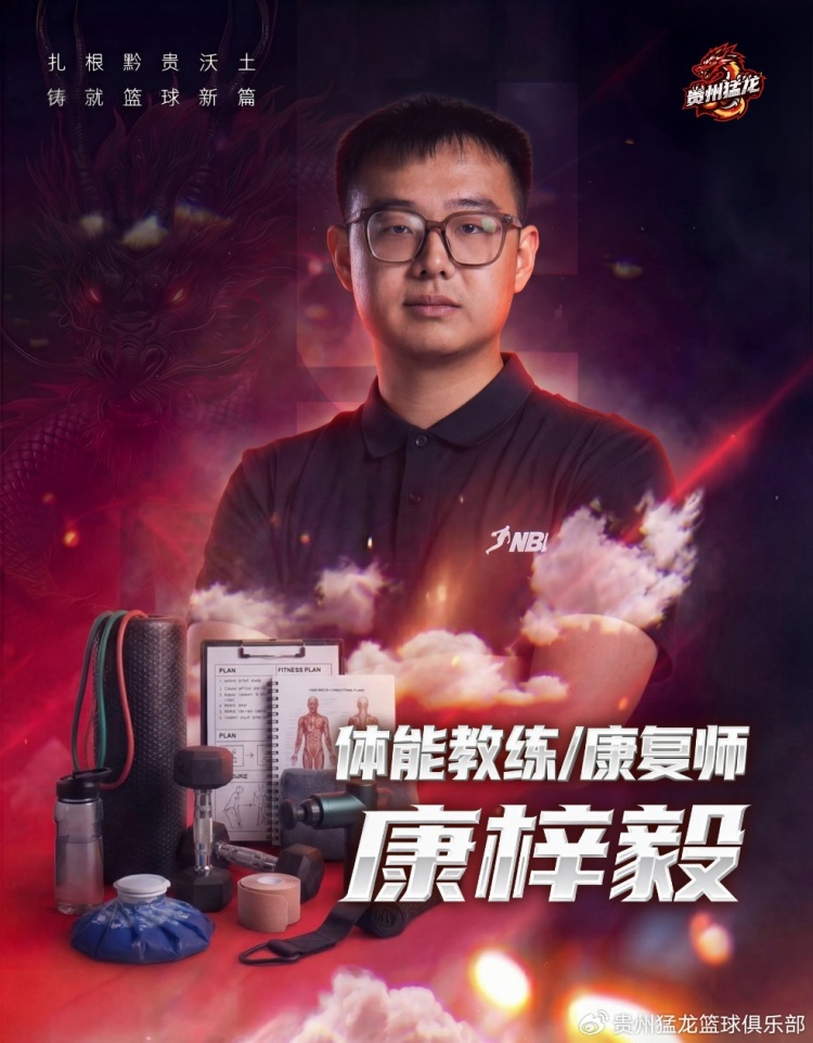 体能教练康梓毅出生于2004年,来自山东青岛。康梓毅曾是一名优秀的跆拳道运动员,曾夺得全国青少年跆拳道锦标赛冠军。退役后,他曾就职于广东省二沙体育训练基地及广州龙狮篮球俱乐部,为郭艾伦等知名篮球运动员提供康复治疗、恢复训练等服务,在业内备受好评。2025年11月,康梓毅加盟贵州猛龙篮球俱乐部,成为球队体能教练及康复师。