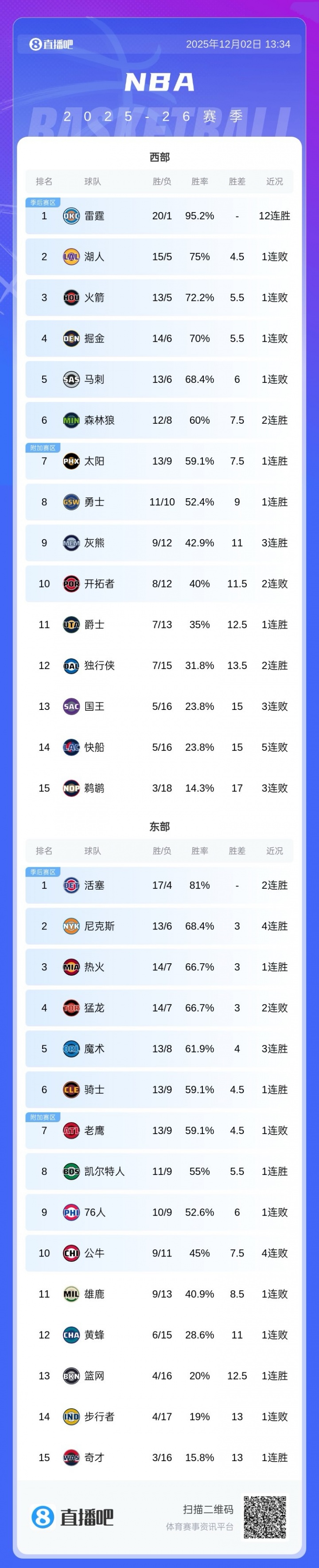 足球比分网12月02日讯 今日NBA,湖人、火箭、掘金全部输球,这样西部2-5都在输球。 西部第一的雷霆仍12连胜,第六的森林狼保持2连胜。