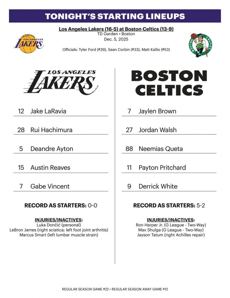 足球比分网12月6日讯 今天上午8点,湖人在客场挑战凯尔特人。 湖人首发:拉拉维亚、八村塁、艾顿、里夫斯、文森特。 绿军首发:杰伦·布朗、沃尔什、科塔、普理查德、怀特。