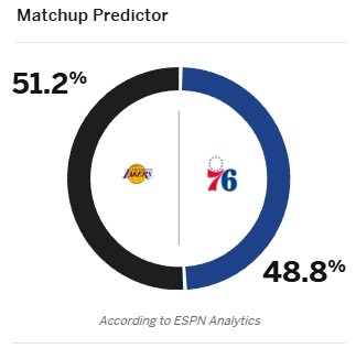 足球比分网12月7日讯 明天上午8:30,湖人客场挑战76人。 今日ESPN给出本场获胜概率预测,湖人为51.2%,76人则是48.8%。
