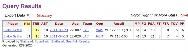 格里芬(2009年状元) 因为09-10赛季报销,2010-11赛季格里芬在正式踏上NBA赛场,菜鸟赛季他两次30+三双,一次31分10篮板10助攻,一次37分17篮板10助攻。
