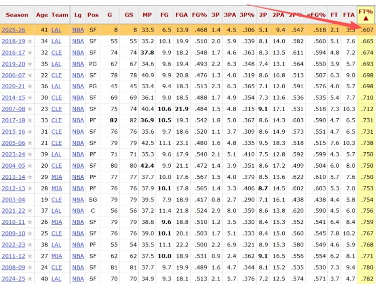 詹姆斯生涯罚球命中率一览 相关新闻>>> 可惜啊!詹姆斯绝平的技术犯规罚球没进 湖人12.2秒仍然落后1分 雷迪克:赛季初我们定了谁罚技术犯规罚球 但那个罚球应卢卡来罚 詹姆斯谈最后技犯罚球:东契奇罚我也没意见 但我都走过去了