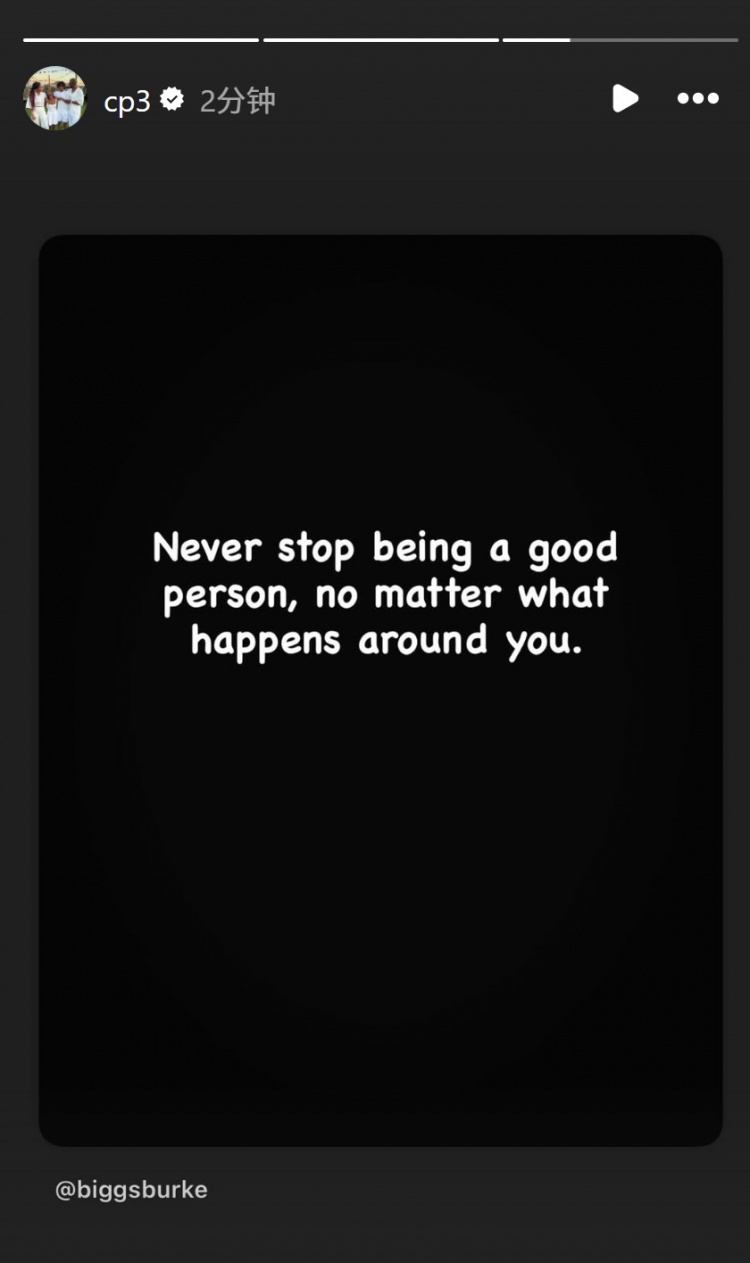 保罗INS转发:无论身边发生什么 都要一直做个好 时间: 2025-12-15 来源: 网络 作者: admin 足球比分网12月14日讯 今日保罗更新个人INS,他转发了一段文字:“无论身边发生什么,都要一直做个好人。” 上一篇:空接之城!2011年的今天:快船交易得到克里斯· 下一篇:说什么悄悄话呢~文班赛后和保罗耳语 随后两人击