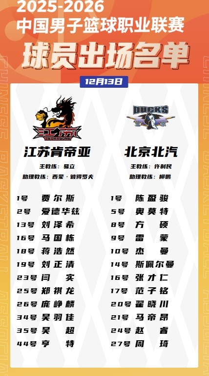 足球比分网12月13日讯 今晚19点35,江苏将在主场迎战北京,双方大名单如下: 江苏:贾尔斯、爱德华兹、刘泽希、马国栋、蒋浩然、刘正清、阎实、郑祺龙、庞峥麟、吴羽佳、吴超、亨特 北京:陈盈骏、奥莫特、方硕、雷蒙、杰曼、斯佩尔曼、张才仁、范子铭、翟晓川、马帝昂、赵睿、周琦