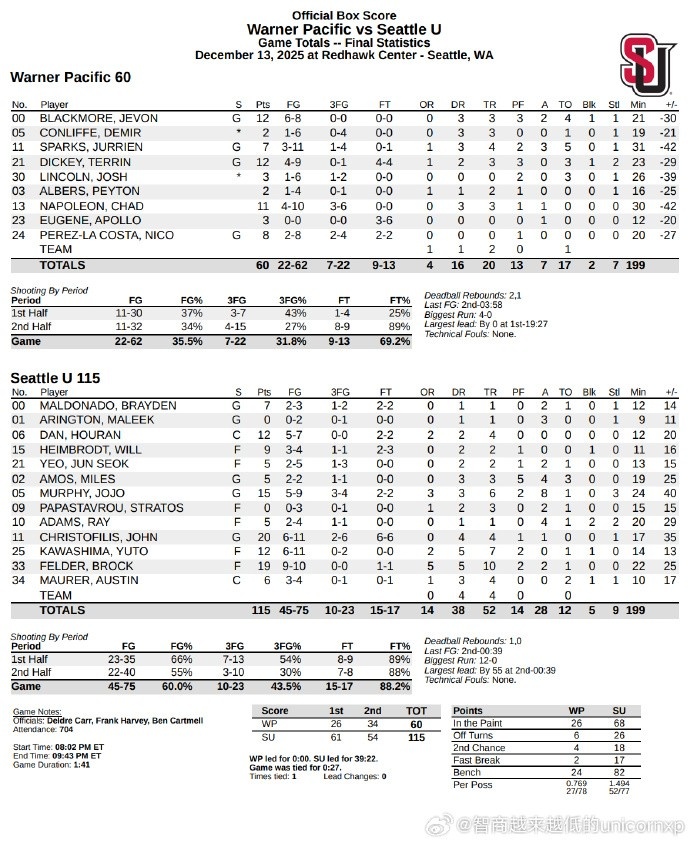 足球比分网12月14日讯 今天,西雅图大学115:60大胜NINA联盟球队的Warner Pacific。 西雅图大学的淡厚然出场12分钟,7投5中,得到12分4篮板。 另一名西雅图大学的亚洲球员吕俊锡,他出场13分钟,5投2中,得到5分2板2助。