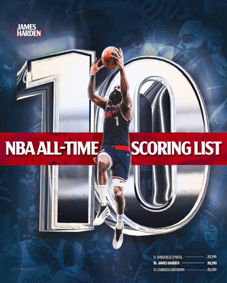 足球比分网12月9日讯 今日快船球星哈登更新IG晒出近日穿搭与自己进入历史得分榜前十的纪录海报。 哈登配文:“工作尚未完成!” 詹姆斯·哈登成为首位主演全AI生成广告的名人...