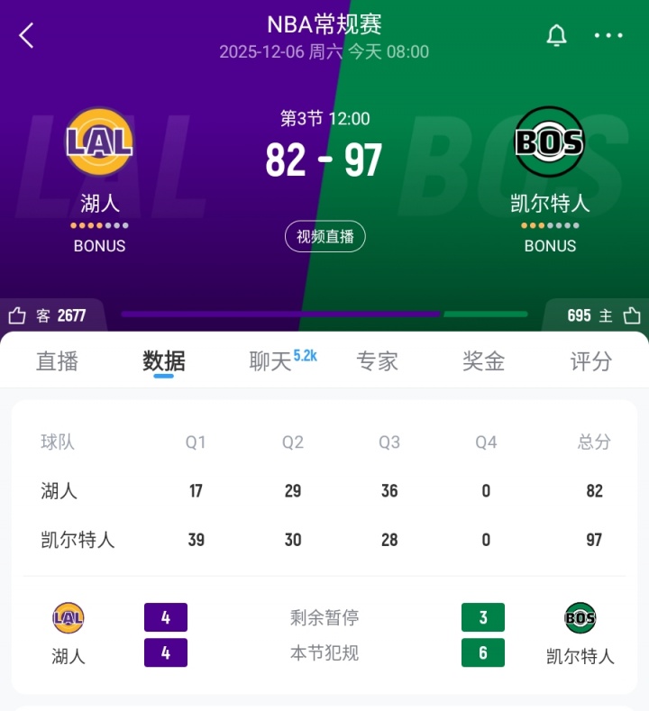 足球比分网12月6日讯 NBA常规赛,凯尔特人三节过后97-82领先湖人。 凯尔特人球员杰伦·布朗在第三节对手掀起反扑时,站出来用接连拿分为球队守住优势。 杰伦·布朗第三节单节10投6中...