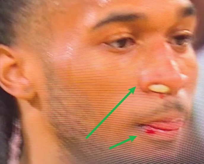 足球比分网12月15日讯 昨日对雷霆的比赛中,卡斯尔嘴部和鼻子出血+鼻子还塞进了棉花,引发球迷好奇他是怎么受伤的。 球迷通过录像里的回放发现,凶手竟是队友文班…… 文班在一...