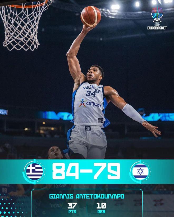雷速体育9月8日讯 在今天凌晨的欧洲杯1/8决赛上,希腊男篮84-79险胜以色列男篮,拿到了八强最后一个晋级名额。 本场比赛,希腊男篮核心字母哥打出统治级别表现,全场23投18中,狂砍...