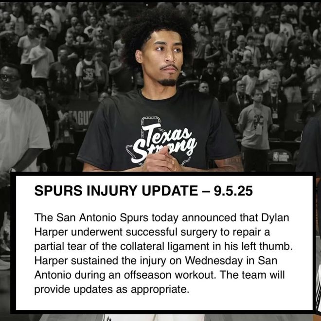 北京时间9月8日,马刺队官方宣布重磅消息:今年榜眼秀迪伦-哈珀在训练中遭遇左手拇指韧带部分撕裂,已经成功接受手术。球队表示哈珀有望赶上10月23日的常规赛揭幕战,但根据该手...