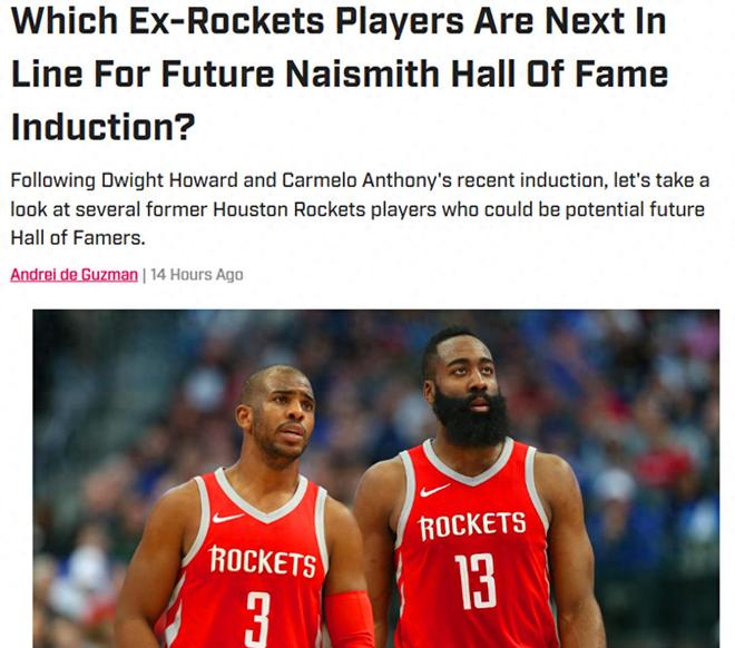 “登炮组合”领跑!在安东尼与魔兽两大旧将正式入选名人堂后,美媒《SI》预测火箭队5大旧将未来将入选名人堂,其中威少屈居第三,哈登与保罗领跑榜单。 安东尼魔兽入选名人堂...