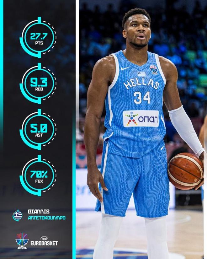 直播吧09月05日讯 欧锦赛小组赛目前已经全部结束,希腊4胜1负以C组小组第一的身份晋级16强。 字母哥小组赛场均出战28.7分钟,砍下27.7分,投篮命中率69.6%,三分命中率100%(只进了一个...
