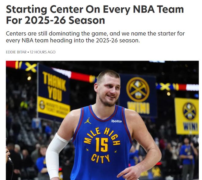 北京时间8月27日,美国媒体FW预测了25-26赛季联盟30支球队先发中锋的人选,海报是联盟第一人尼古拉-约基奇,他肯定是掘金的先发中锋这一点毫无悬念。 掘金约基奇、费城恩比德、老...