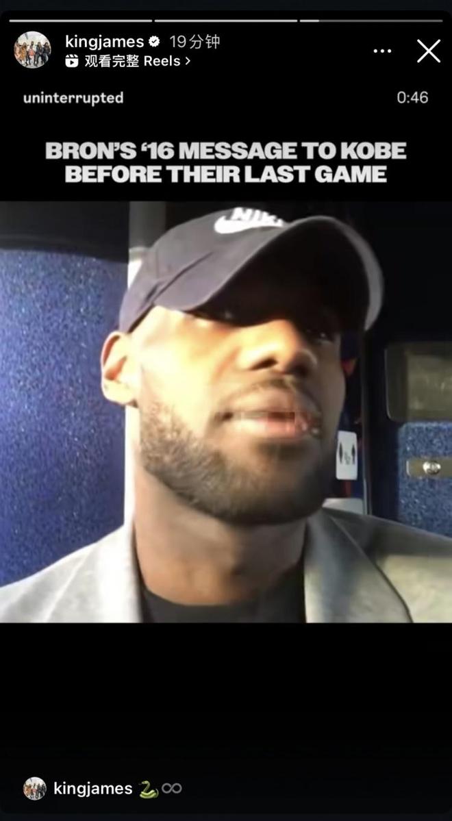 直播吧8月25日讯 湖人前锋詹姆斯更新Instagram Story动态。 詹姆斯转发了他在2016年生涯最后一次与科比交手前录制的感言:“这是我最后一次与史上最伟大球员之一科比-布莱恩特交手的机...