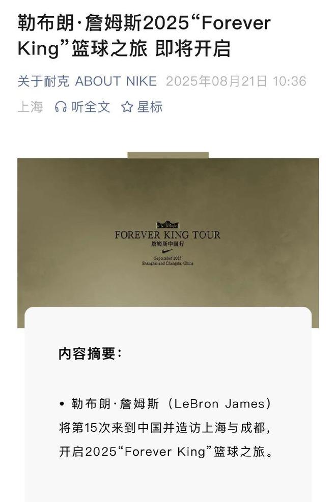 雷速体育8月21日讯 根据NIKE官方消息:湖人球星詹姆斯即将开启第15次中国行并造访上海和成都。原文如下: 勒布朗·詹姆斯(LeBron James)即将携手耐克开启第15次中国行,这也是距他首...