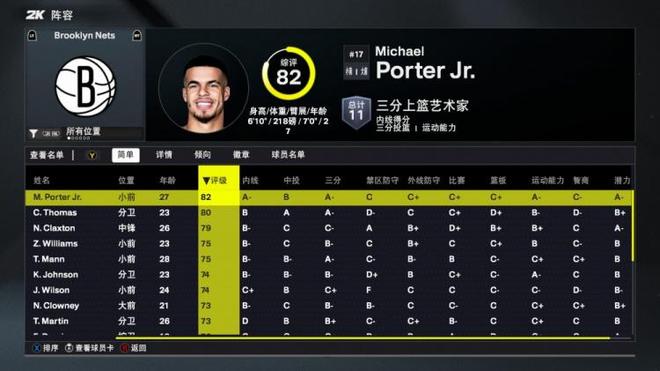 直播吧8月30日讯 NBA2K26各队球员能力值出炉,其中篮网详情如下: 新援小波特82全队最高,托马斯80全队第二,篮网唯二两位80+; 克拉克斯顿79,扎威和曼恩75,基翁-约翰逊和威尔逊74,...