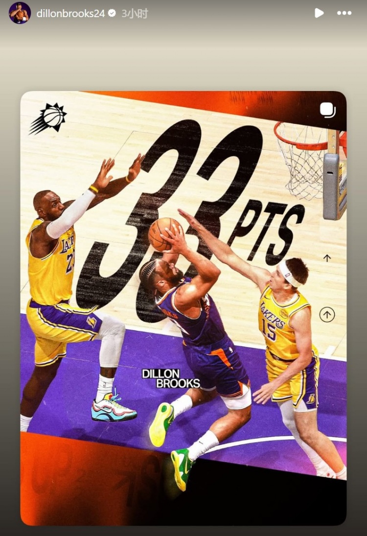 足球比分网12月2日讯 太阳客场125-108击败湖人,终结对手的7连胜。 赛后,狄龙转发了一张自己上篮的照片,而詹姆斯和里夫斯当了背景板,还有他的得分。 相关阅读: 狄龙:我想让詹...