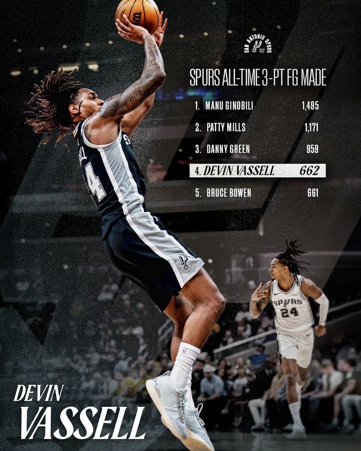足球比分网11月29日讯 NBA杯小组赛,马刺客场挑战掘金。 瓦塞尔迎来里程碑,他的三分命中数来到662记,超越布鲁斯·鲍文升至队史第四。 马刺队史第一的是吉诺比利的1495次。...