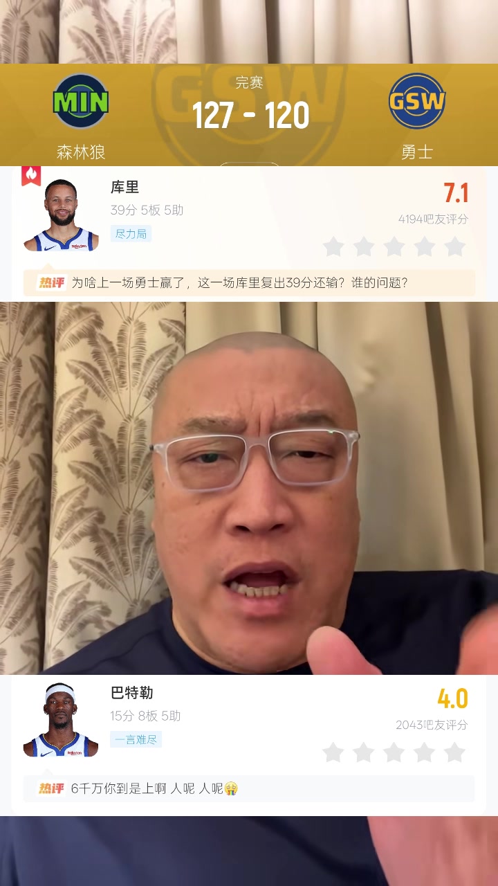 足球比分网12月13日讯 NBA常规赛,勇士120-127不敌森林狼。 本场比赛,勇士球星巴特勒表现中规中矩,虽然出场时间全队最多但出手数略少,末节更是只有1分,在37分钟的时间里,投篮...