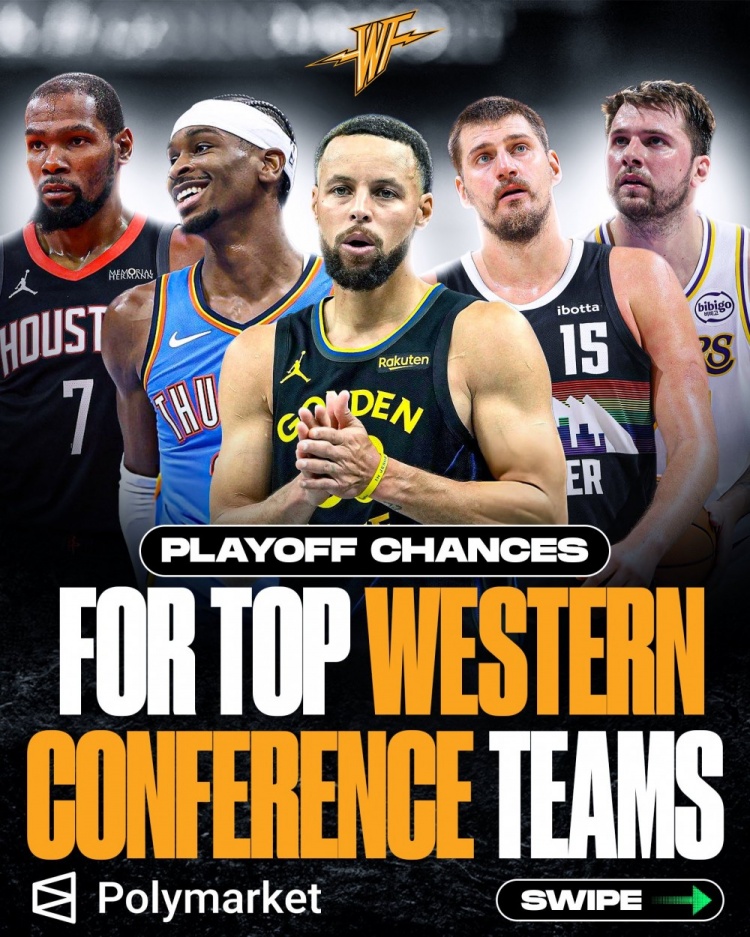 足球比分网11月29日讯 今天,市场预测机构PolyMarket给出了西部各队进季后赛概率预测。 勇士仍在85%胜过了马刺的79%,而湖人则高达95%。...