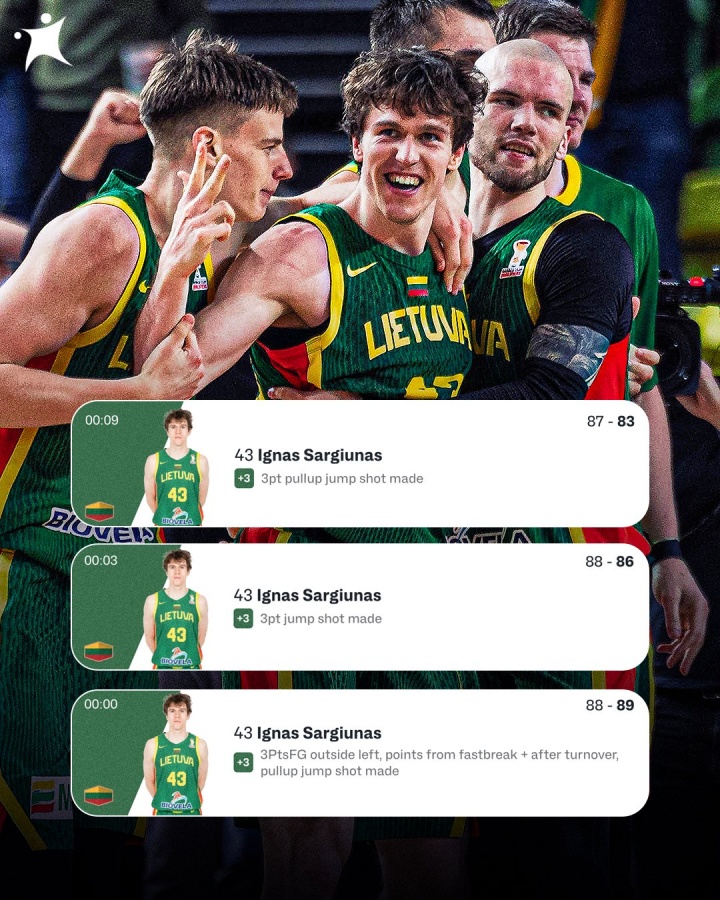 足球比分网11月28日讯 在今日的 FIBA世界杯欧洲预选赛,立陶宛后卫Ignas Sargiuna上演了更疯狂的麦迪时刻。 当时时间还剩12.9秒,立陶宛80-87落后英国,Sargiuna轰进三分球时间定格9.8秒,随...