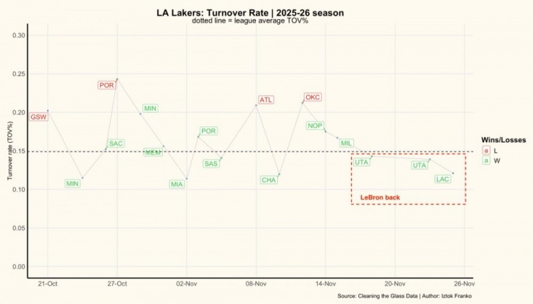 备注:虚线为联盟平均线,绿色为赢球比赛失误率,红色为输球比赛失误率 失误率:记录球员在场时失误次数与总持球数的比值。( 球队失误率 = 球队失误数 / (球队投篮出手数 + 0...