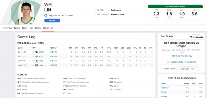 足球比分网11月26日讯 中国球员林葳所在的俄勒冈大学,今日背靠背作战,最终80-97不敌圣地亚哥州立大学。 比赛下半场,林葳连续两次命中标志性跳投,连拿5分。 全场比赛,林葳出战...