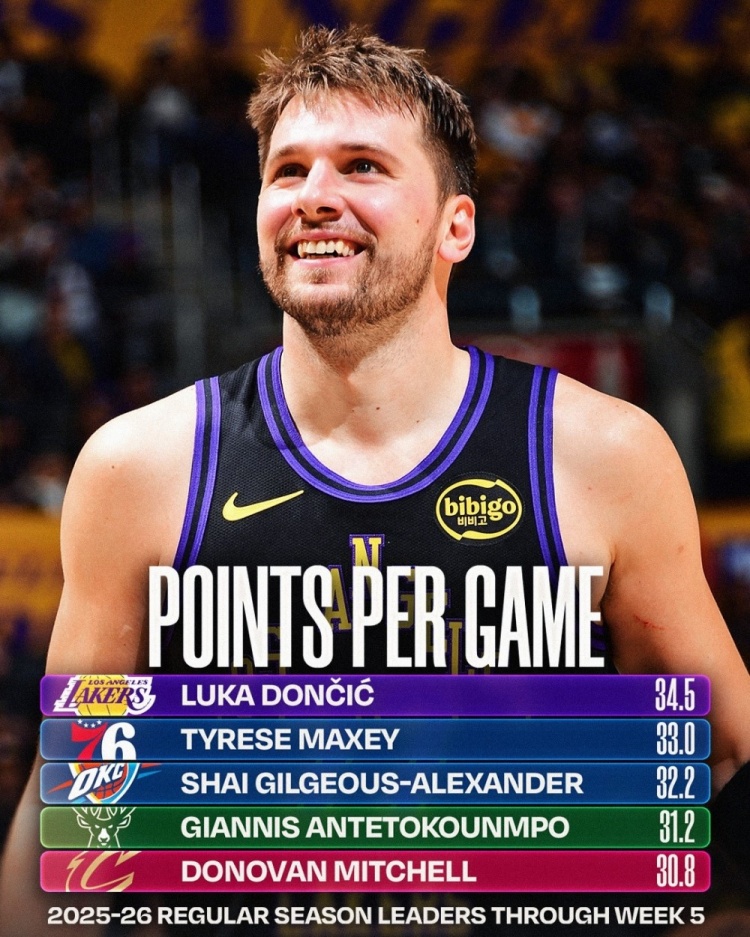 足球比分网11月25日讯 今天,NBA官方更新了新赛季前五周的场均得分榜、总得分榜。 场均得分榜: 1、东契奇:34.5分 2、马克西:33分 3、亚历山大:32.2分 4、字母哥:31.2分 5、米切尔:...