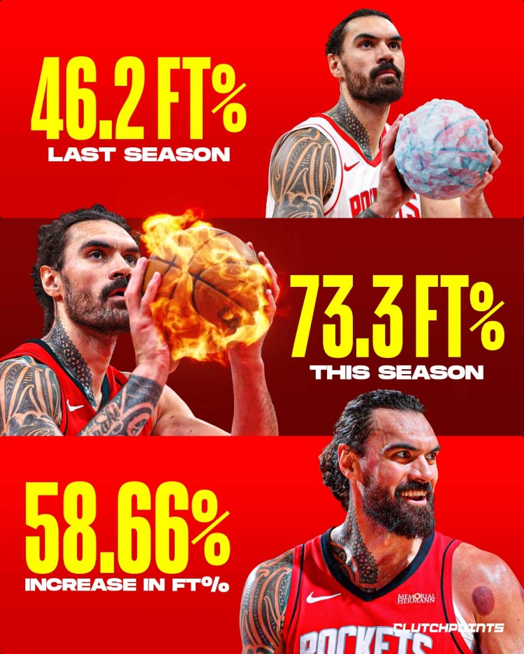 亚当斯上赛季罚球命中率46.2%,本赛季73.3%,进步幅度58.66%(46.2%×58.66%+46.2%=73.3%);生涯罚球命中率为53.3%...
