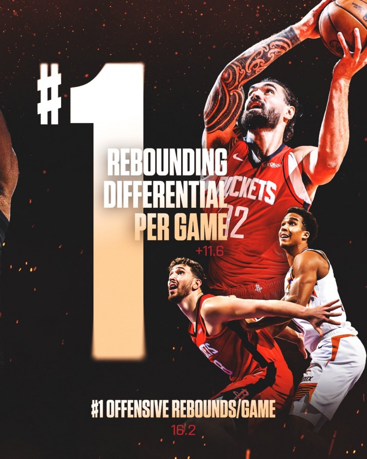 火箭目前场均净胜对手11.6个篮板,联盟第一。场均进攻篮板数为16.2个。 火箭全队三分命中率42%,联盟第一。伊森三分50.9%,联盟第一;谢泼德47.1%,联盟第八。...