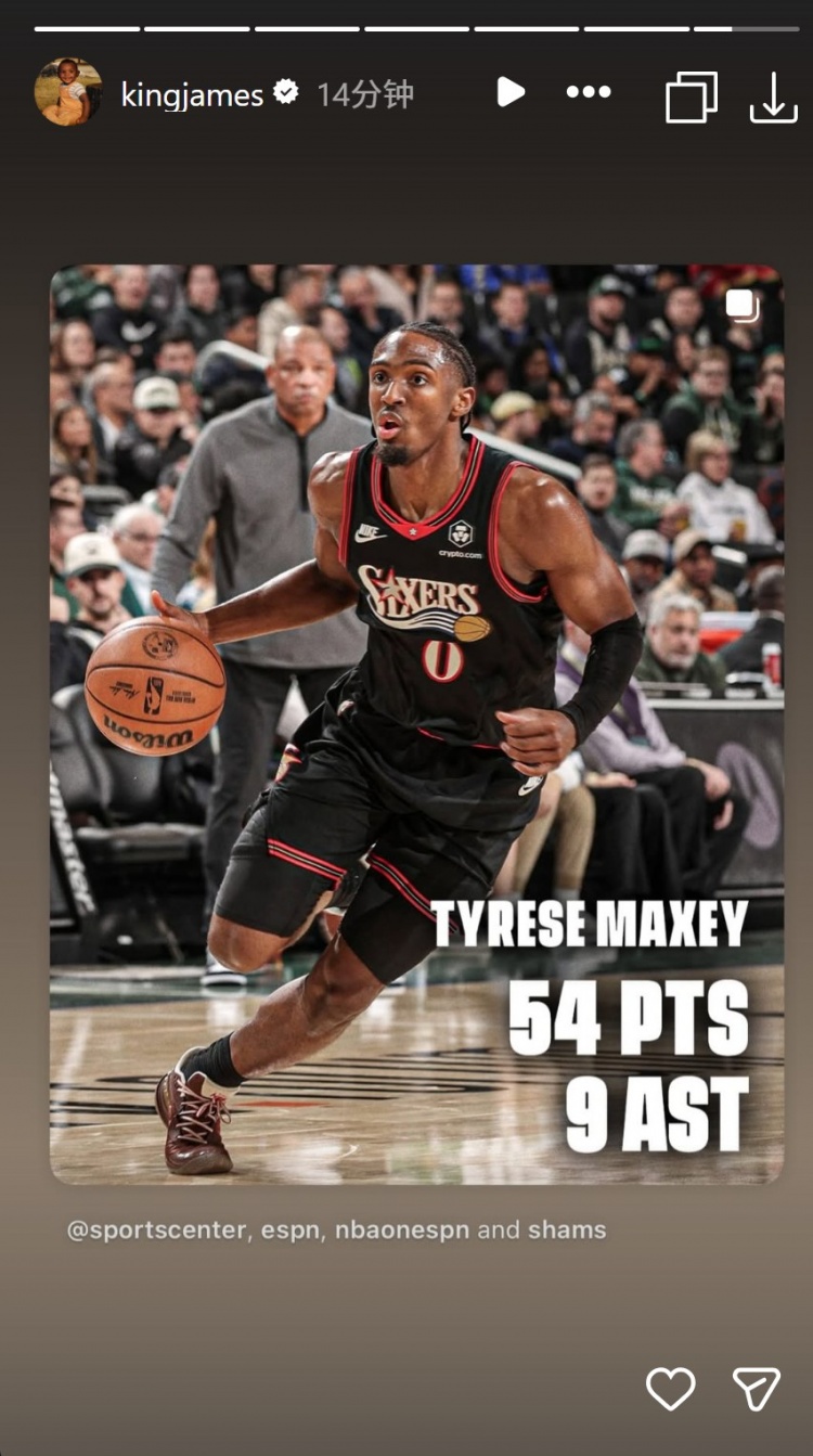 足球比分网11月21日讯 今天NBA常规赛,76人客场123-114加时力克雄鹿。 赛后湖人球星詹姆斯转发了马克西数据海报——54分9助攻。 本场比赛,马克西出战46分钟,30投18中,三分15中6,罚球...