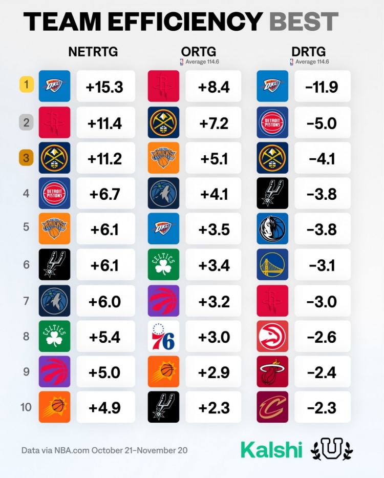 足球比分网11月21日讯 美媒Basketball University发布了赛季至今的各队净效率、进攻效率以及防守效率前十的帮当。其中雷霆净效率+15.3排名第一,进攻效率火箭+8.4排名第一,防守效率雷霆...