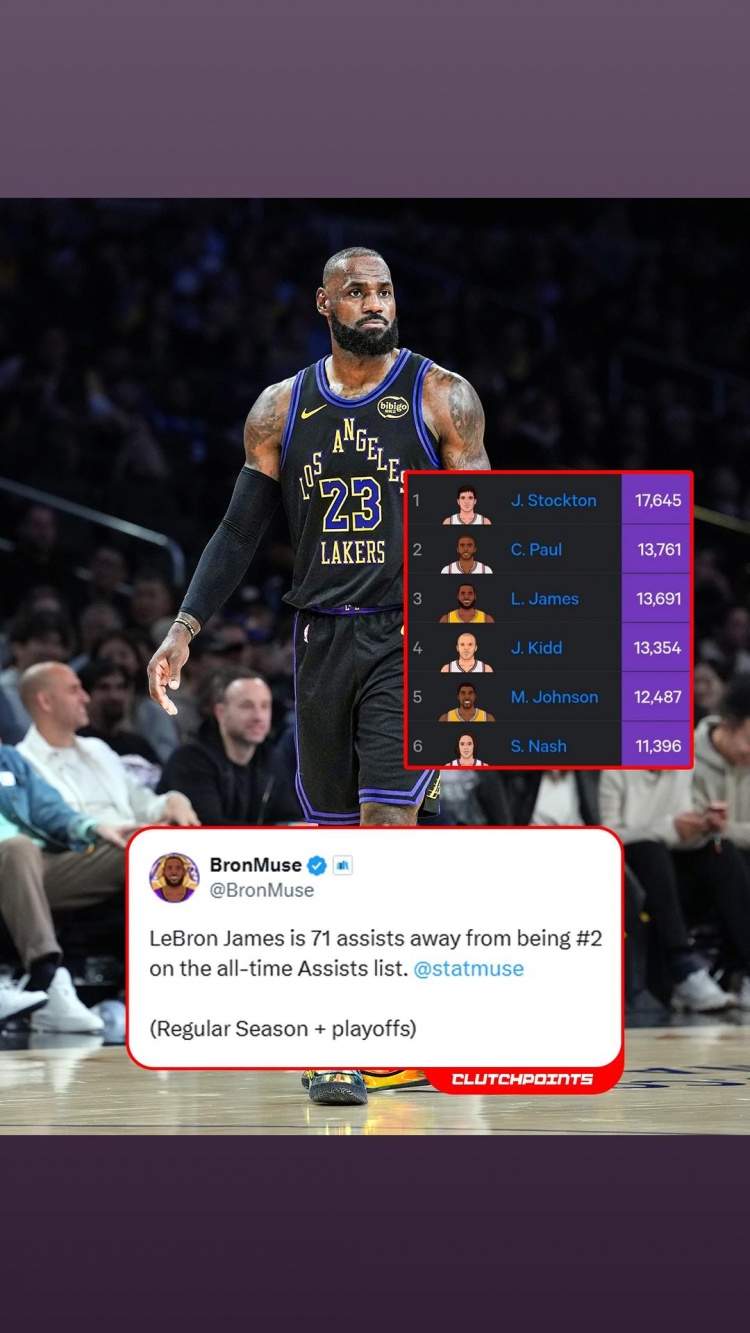 足球比分网11月21日讯 美媒BronMuse晒出了詹姆斯生涯常规赛+季后赛总助攻数(13691),距离超越历史第二的保罗仅差71次。具体排名如下(今日赛前数据): 1、斯托克顿 17645次 2、保罗...