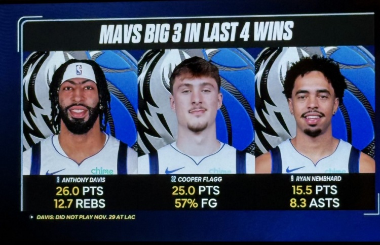 足球比分网12月13日讯 NBA常规赛,独行侠将对阵篮网。 赛前,转播方给出独行侠过去4场胜利,浓眉、弗拉格、小纳姆哈德三人组的数据: 浓眉场均26分12.7板 弗拉格场均25分,命中率5...