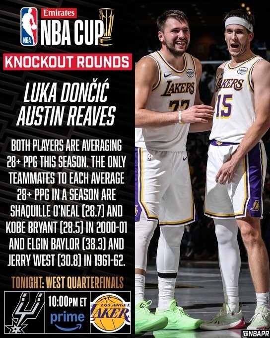 东契奇(场均35.0分)与里夫斯(场均28.4分)分列本赛季得分榜第一和第八位,两人场均得分均超过28分。 历史上单赛季场均同时达到28+分的队友组合仅有:2000-01赛季的奥尼尔(28.7分)...