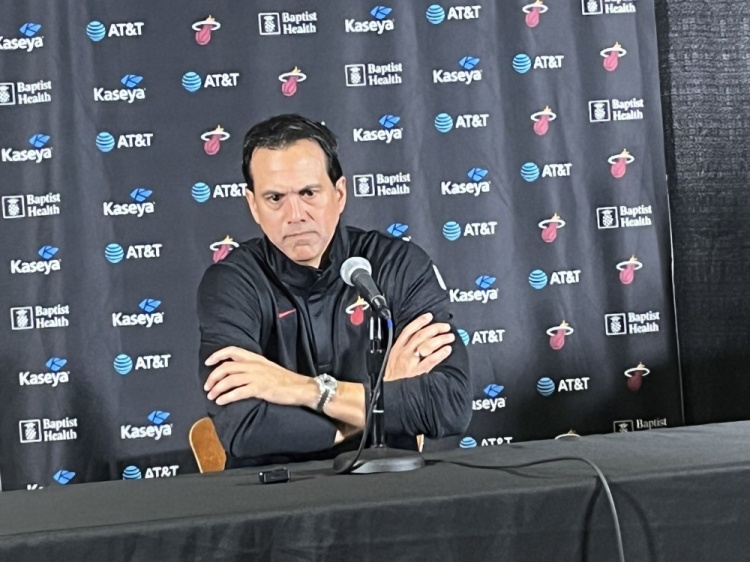 足球比分网12月10日讯 NBA杯,热火108-117不敌魔术。 赛后采访,主帅斯波表情凝重,谈到本场失误他表示:“对手在第二节打得非常棒,而我们总在犯同样的错误,当我们无法投进球时,...