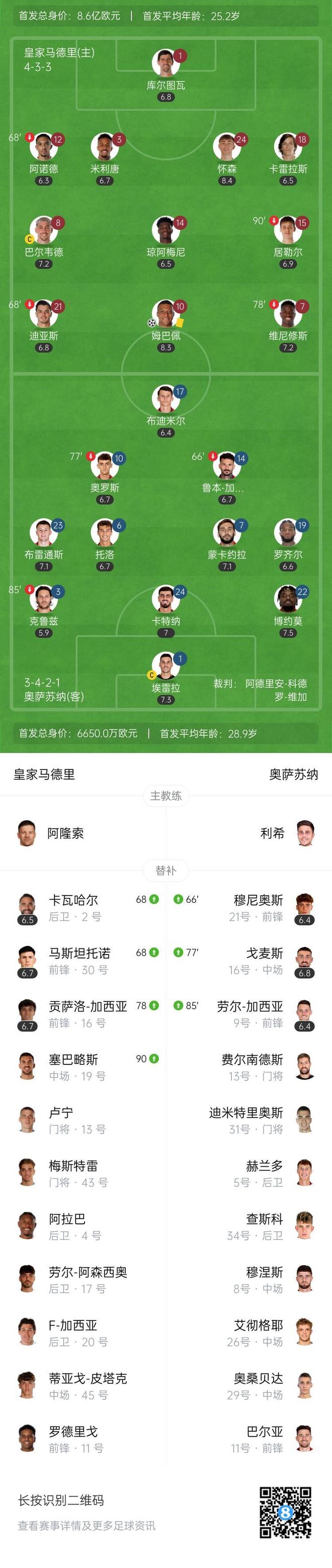 下半场补时5分钟。最终全场比赛结束,皇马1-0奥萨苏纳。 【双方首发及换人信息】