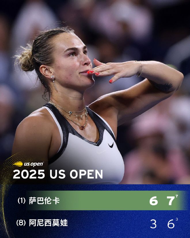 北京时间9月7日,2025年美网女单决赛,卫冕冠军、世界第一萨巴伦卡对阵8号种子阿尼西莫娃。萨巴伦卡以6-3和7-6(3)连赢两盘,最终萨巴伦卡总分2-0横扫战胜阿尼西莫娃实现美网两连冠。萨巴伦卡豪取美网13连胜实现2连冠,夺得美网女单第2冠与生涯大满贯女单第4冠,今年四大满贯收获1冠2亚成绩,且达成生涯大满贯100胜里程碑。