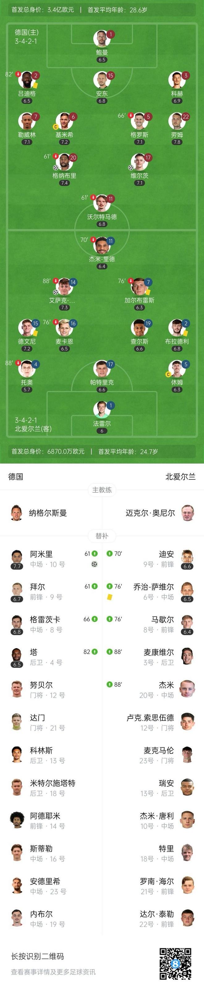 全场比赛结束,德国3-1北爱尔兰。 【双方首发以及换人信息】