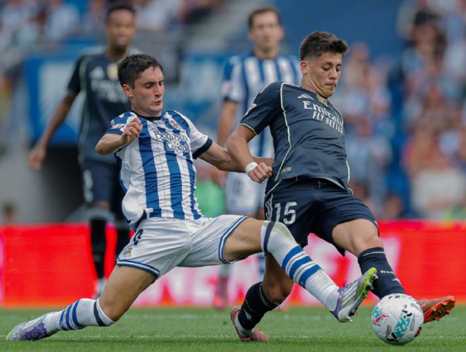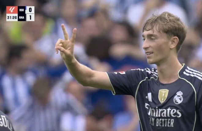 皇马首发:1-库尔图瓦、2-卡瓦哈尔、3-米利唐、18-卡雷拉斯、24-赫伊森、14-琼阿梅尼、15-居勒尔、19-塞巴略斯、7-维尼修斯、10-姆巴佩、21-迪亚斯 皇家社会首发:1-雷米罗、6-埃鲁斯通多、17-塞尔吉奥-戈麦斯、16-卡莱塔、5-祖贝迪亚、4-戈罗查特吉、22-戈蒂、28-巴勃罗-马林、7-巴雷内切亚、10-奥亚萨瓦尔、11-格德斯 开场仅仅2分钟,居勒尔完成破门,因姆巴佩越位在先,进球无效。