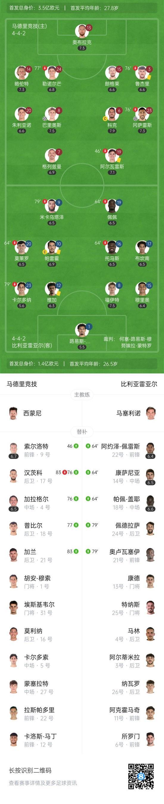 下半场补时5分钟,马竞2-0比利亚雷亚尔。 双方首发以及换人信息: