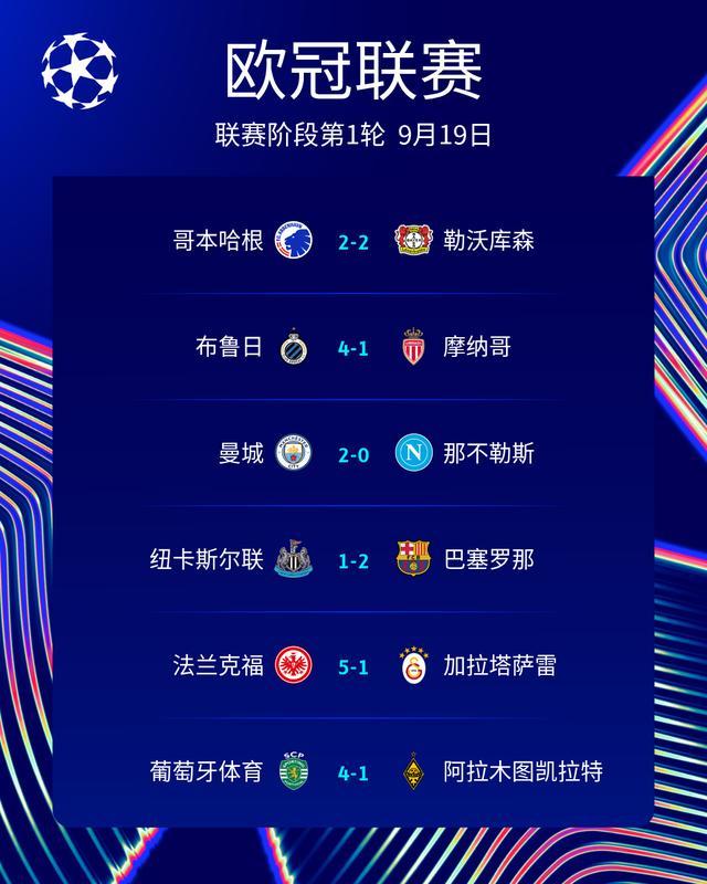 至此,本赛季欧冠联赛阶段第1轮第3天的6场比赛战罢:哥本哈根2-2勒沃库森、布鲁日4-1摩纳哥、曼城2-0那不勒斯、纽卡斯尔联1-2巴塞罗那、法兰克福5-1加拉塔萨雷、葡萄牙体育4-1阿拉木图凯拉特。