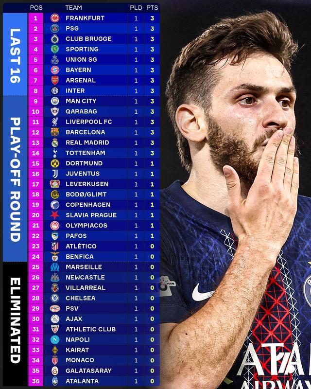 第1轮过后,欧冠联赛积分榜更新,法兰克福以净胜球优势领跑,身后是身后是巴黎、布鲁日、葡萄牙体育、圣吉罗斯联合、拜仁慕尼黑、阿森纳、国际米兰!
