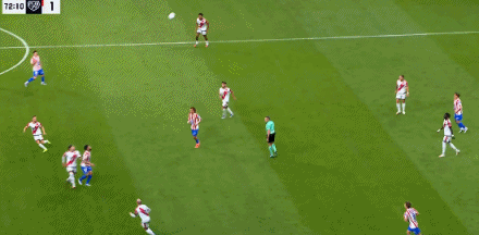 第77分钟,逆转!加西亚单刀过掉门将后推射入网,马竞1-2巴列卡诺